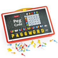 Use pegs and letter to write and decode messages with the Ped Code. Think of a secret word and write it in code, using the special alphabet made up of coloured pegs. The game contains cards in different alphabets, so you can create codes in foreign languages.
