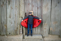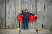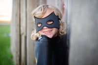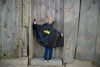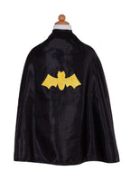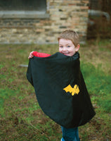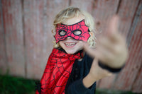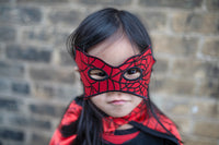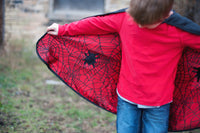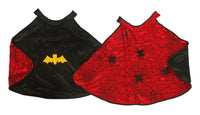 This adorable reversible cape offers twice the fun and is a perfect addition to the dress-up collection. The black satin side features a yellow bat emblem and reverses to a red spider web satin print on the reverse side with large black velour foam spider details. The Velcro closure at the neck makes switching superheroes a breeze. Comes packaged with a matching double-sided mask.