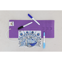 One reusable mat, three non toxic pens, light blue, dark blue & black and a purple felt pouch. Mats measure 20 x 15cm and wipe clean.
