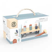 Have fun while developing hand/eye co-ordination with this hammer bench! Tap the six coloured wooden pegs down through the holes with the sturdy hammer to create a flat workbench. Endless fun as a simple turnover of the bench means your little one gets to start all over again! This wooden toy is designed with gently curved edges and comes in our pastel colour palette. This toy is crafted from sustainably sourced wood from FSC® certified forests and coated with non toxic paint.