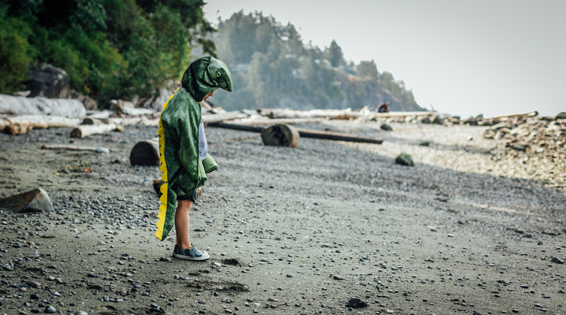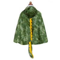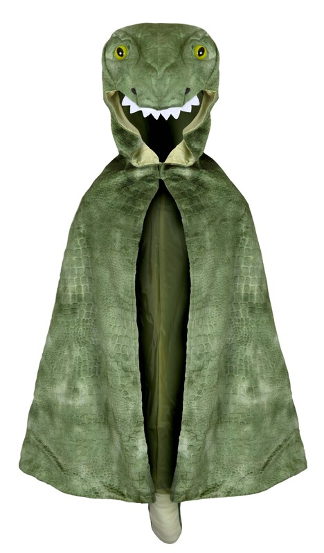 This dinosaur cape features textured velour fabric, realistic eyes, and 3D stuffed detailing on the hood. The design includes a long trailing tail and big felt teeth. A lined hood and Velcro closure makes this cape durable and ready for many wears.