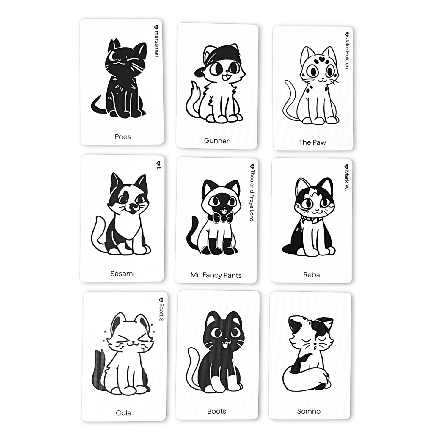 There are 4 sets of Crowd Cards, 120 unique, hand-drawn Cat Cards and 7 ways to play.