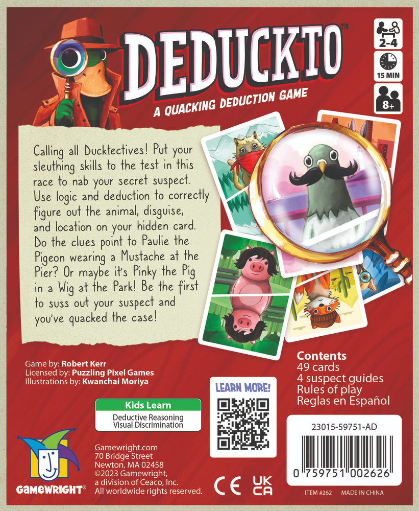 Put your sleuthing skills to the test in this race to nab your secret suspect! Use logic and deduction to figure out the animal, disguise, and location on your hidden card. Be the first to suss out your suspect and win!