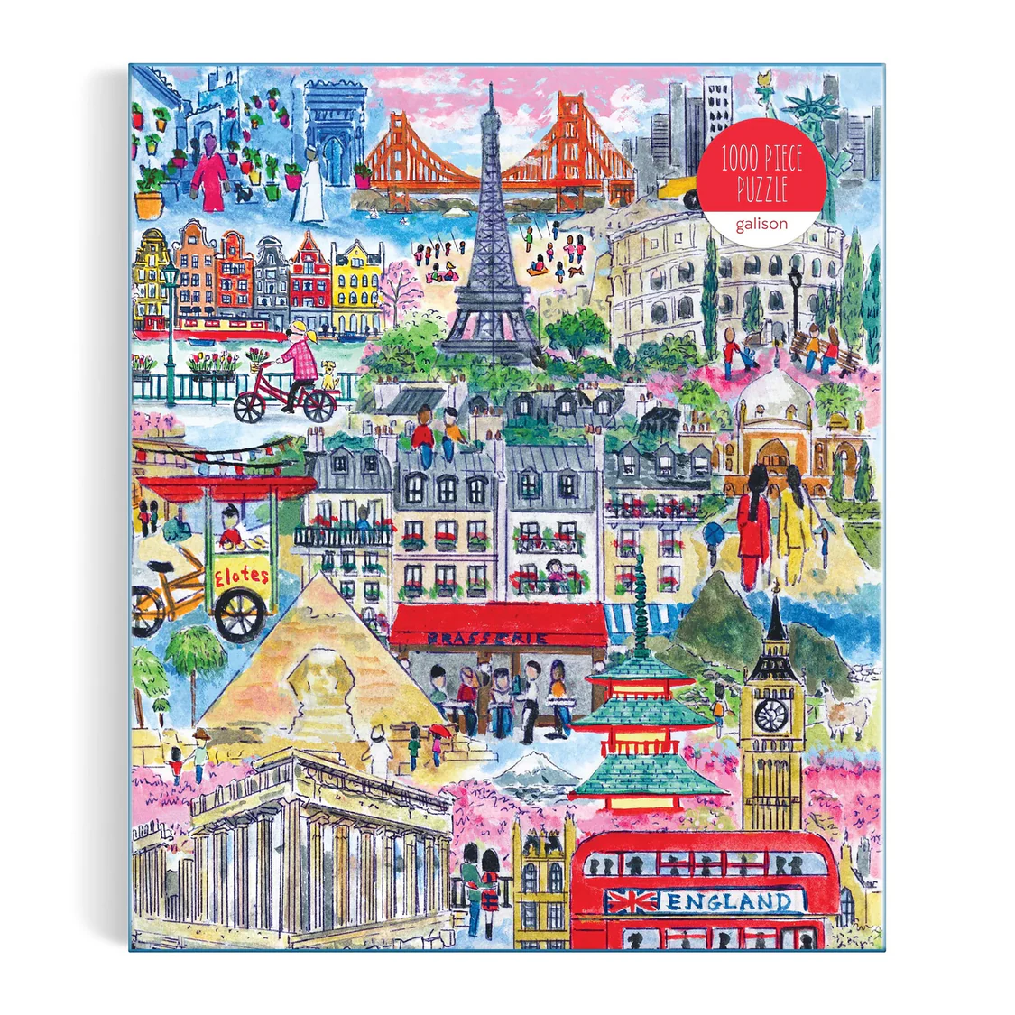 1000 PIECE PUZZLE – Embark on a captivating journey across the globe with Galison's stunning 1000-piece puzzle featuring the vibrant artwork of Michael Storrings showcasing cities around the world.