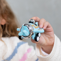 Hey, presto! This retro mini racing plane is ready to roll (not fly). Kids will have a hoot with these nimble little battery-free vintage-styled planes. Activate the propulsion mechanism with a simple press-down of the pilot, and they’re off! In three fun and collectable designs.